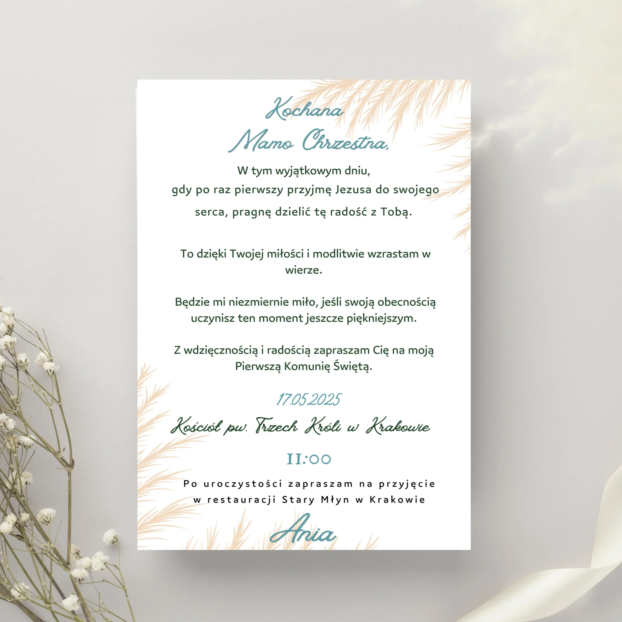 - Design: Subtelny motyw traw pampasowych w odcieniach beżu nadaje zaproszeniu nowoczesny charakter w stylu boho. Estetyka wzbogacona delikatnymi detalami graficznymi tworzy harmonijną całość.