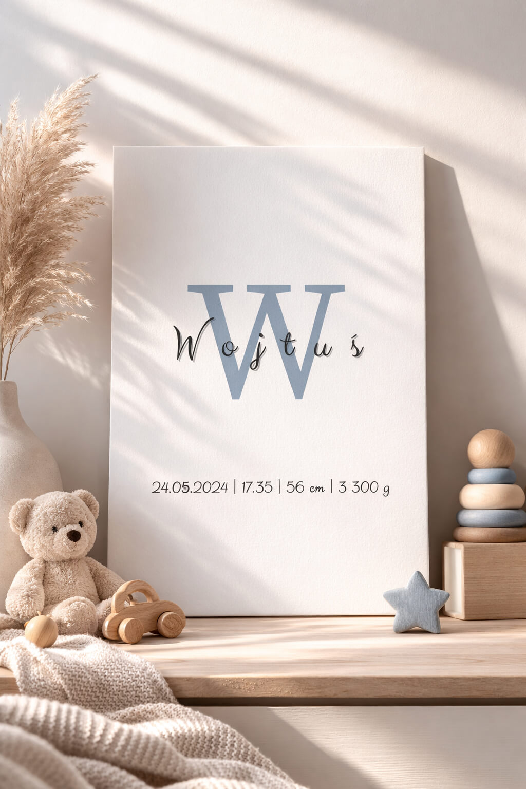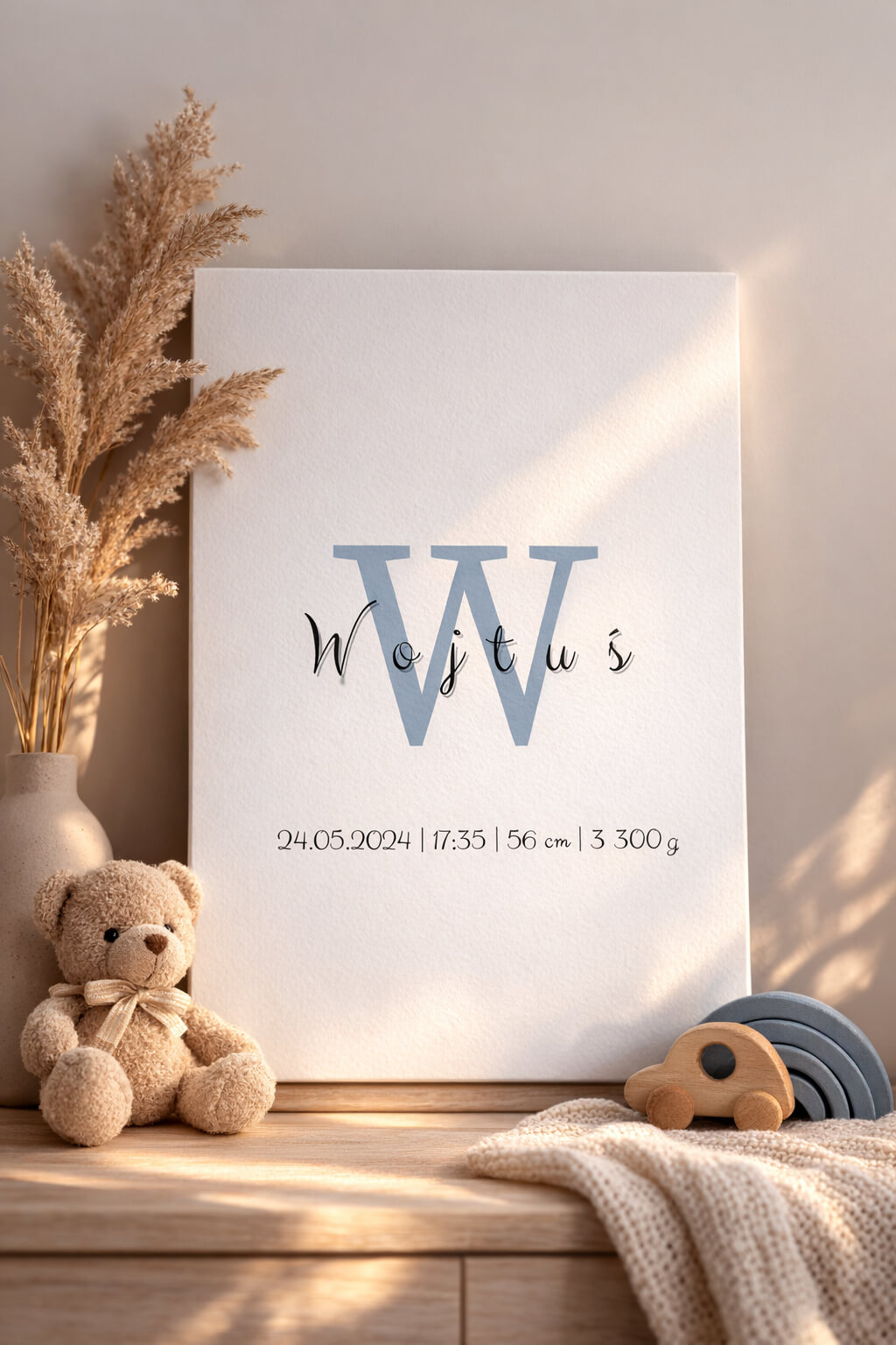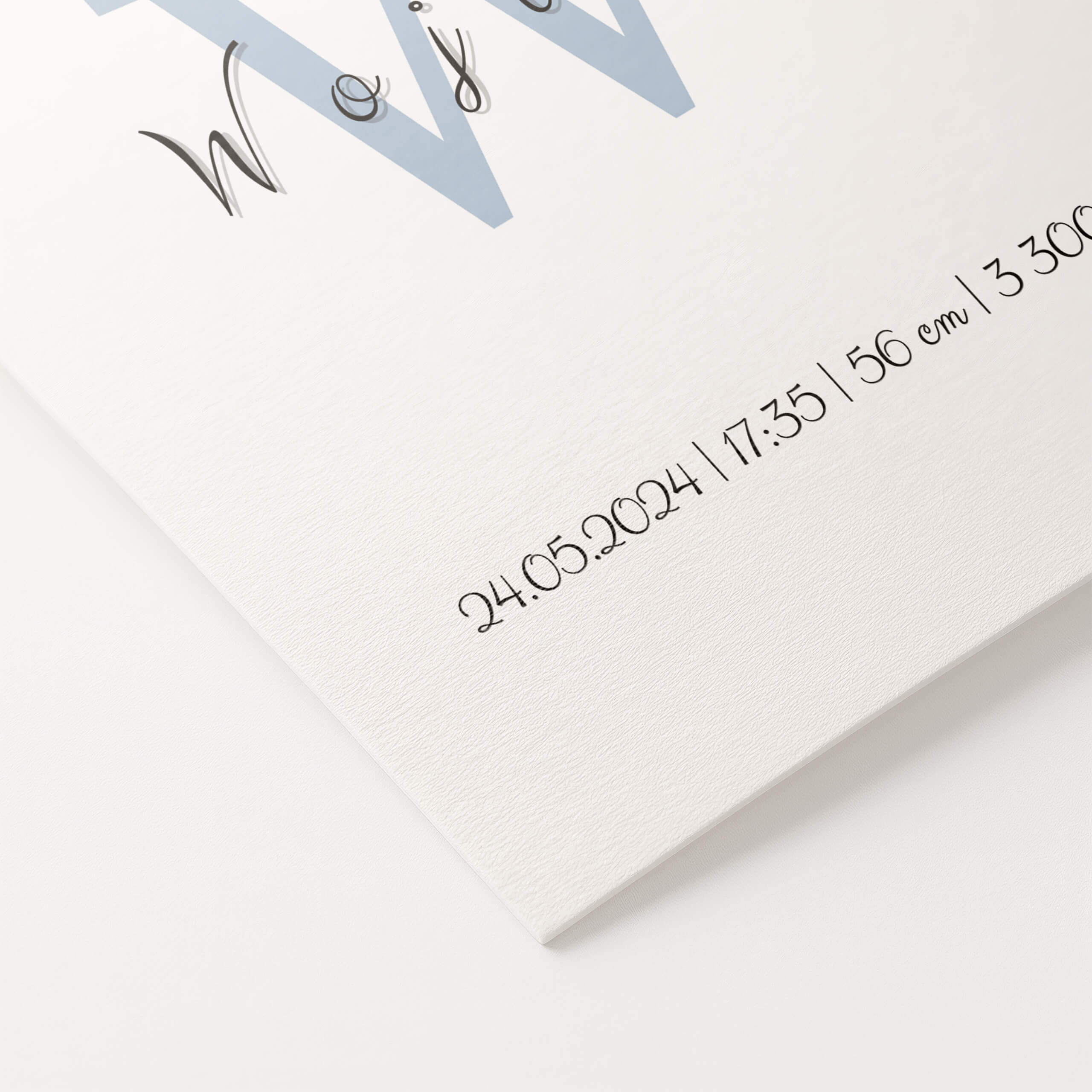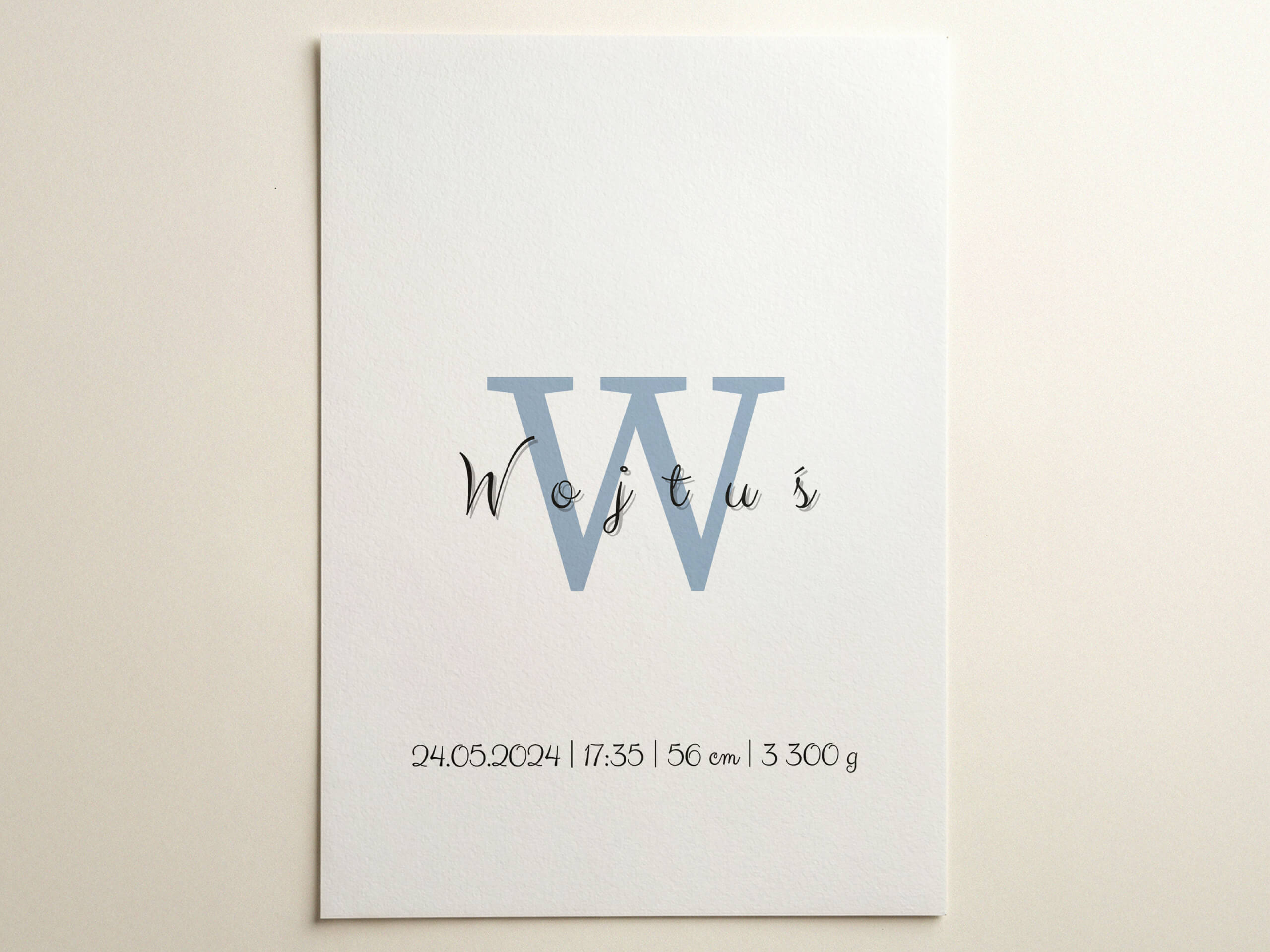 Ta metryczka urodzenia opiera się na prostocie. Duża litera inicjału w stonowanym, niebieskim odcieniu nadaje charakteru, a delikatnie zapisane imię dodaje lekkości.