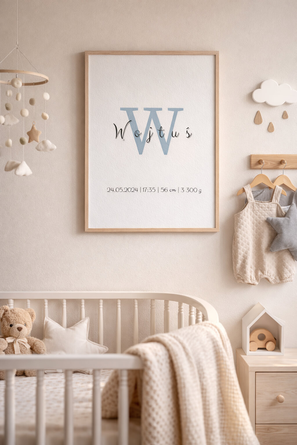 To projekt, który nie przytłacza. Spokojny, czysty i bardzo estetyczny — idealny do pokoju chłopca, ale również do wnętrz neutralnych.
