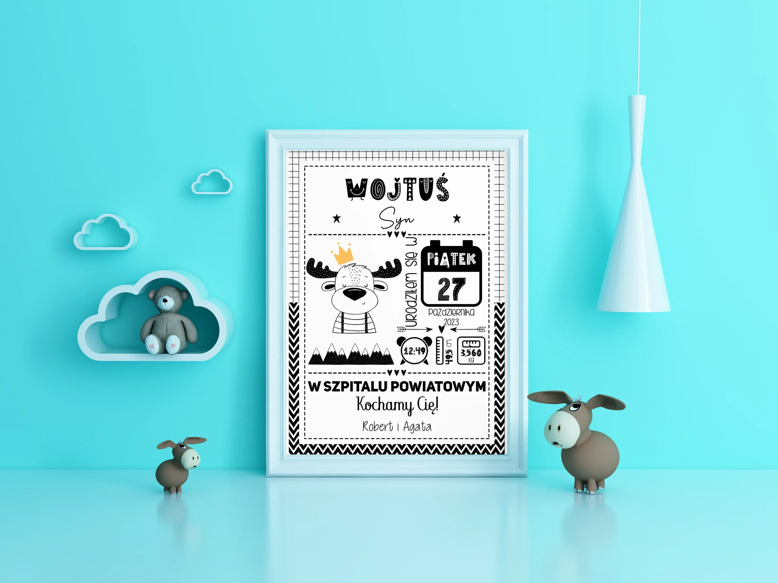 - ✅ Pełna personalizacja – dodaj imię, datę urodzenia, wagę, wzrost oraz godzinę narodzin.