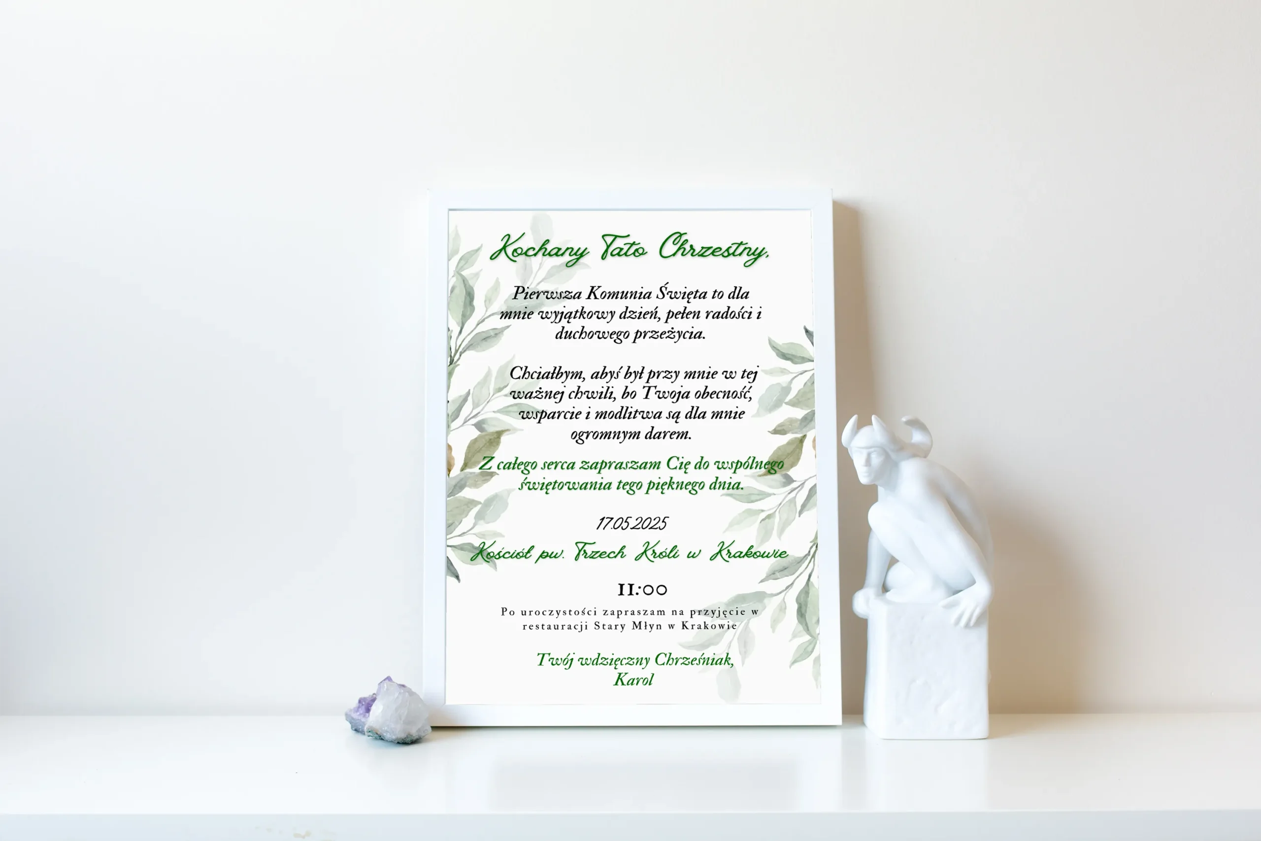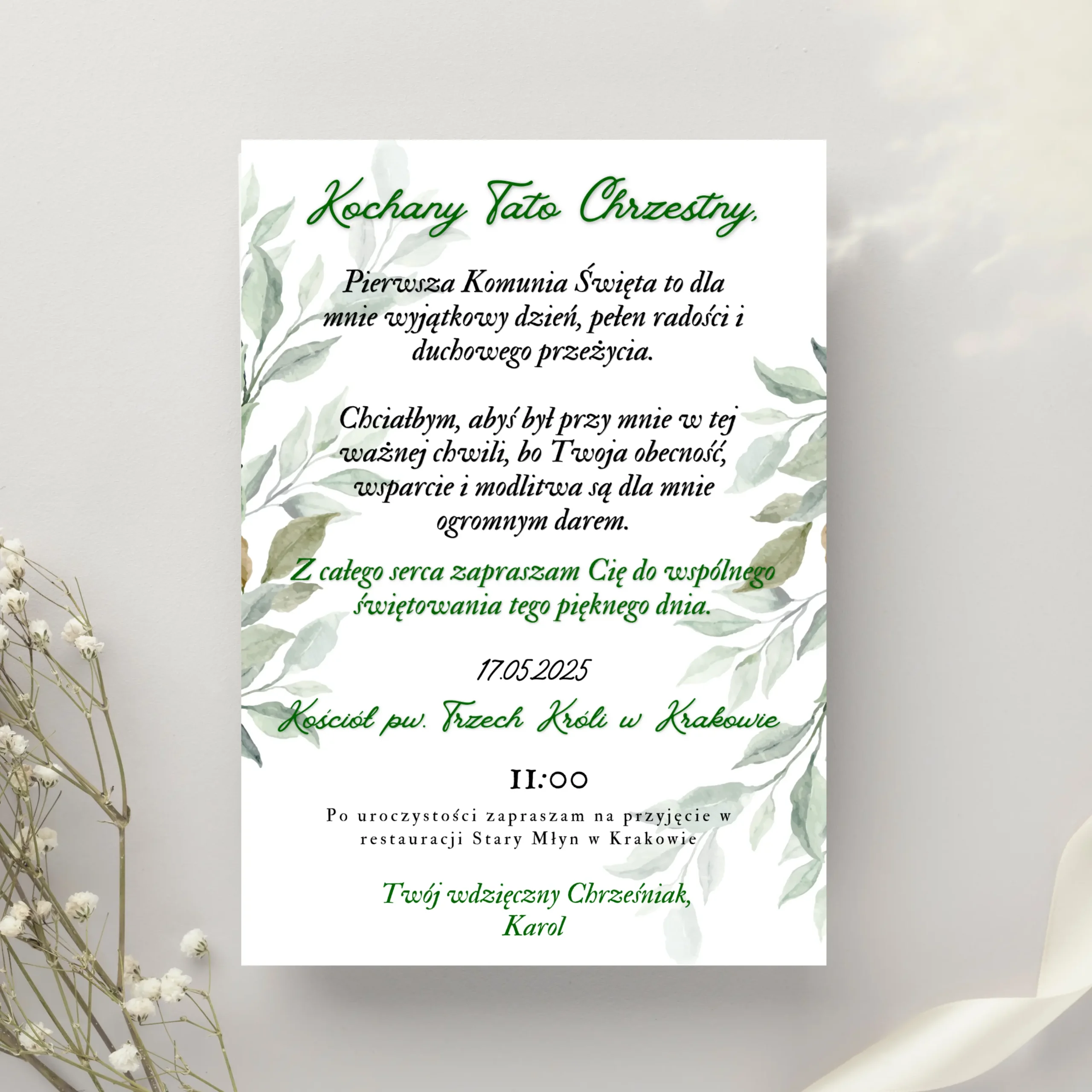 Eleganckie, personalizowane zaproszenie dla Ojca Chrzestnego na Pierwszą Komunię Świętą z botanicznym motywem i wzruszającym tekstem.