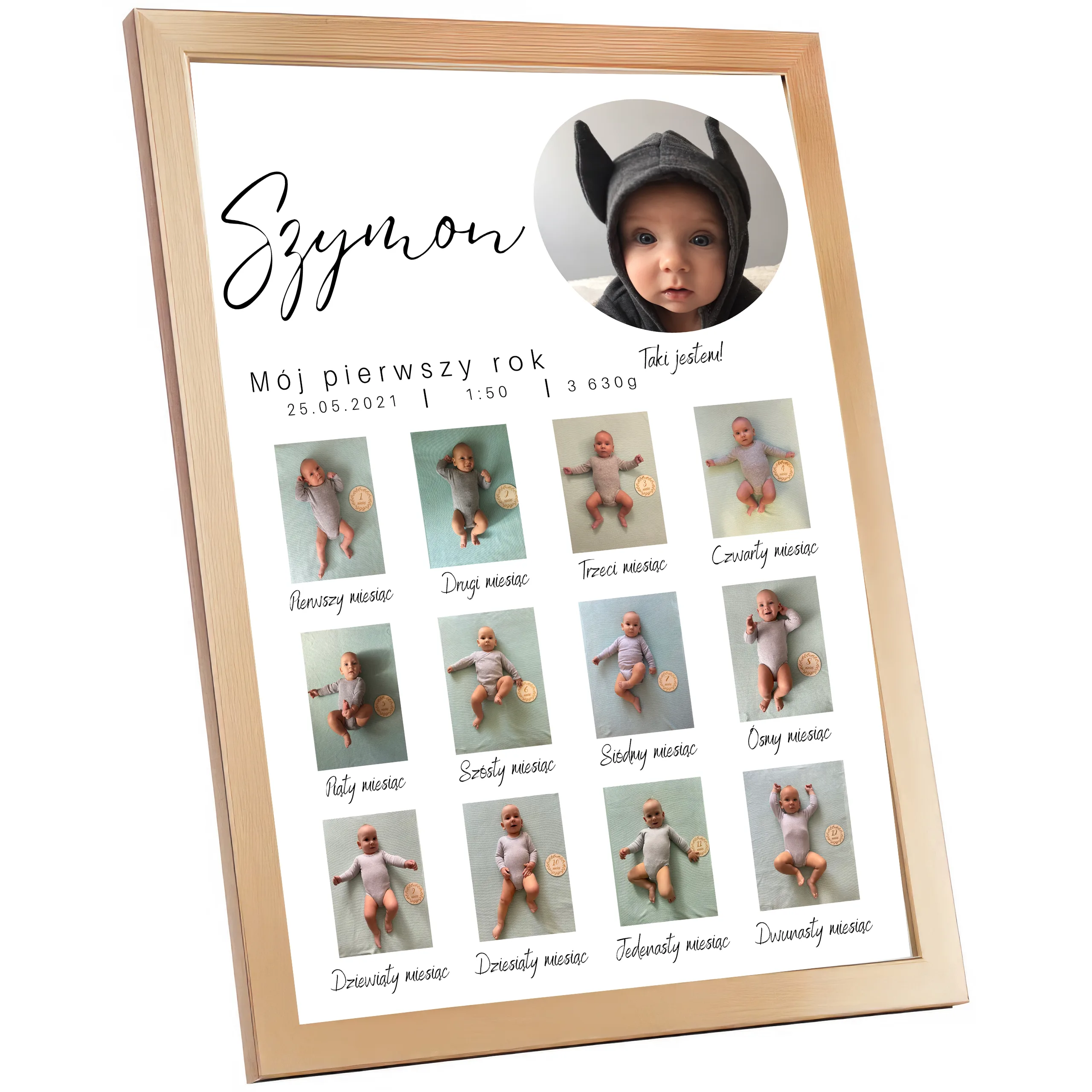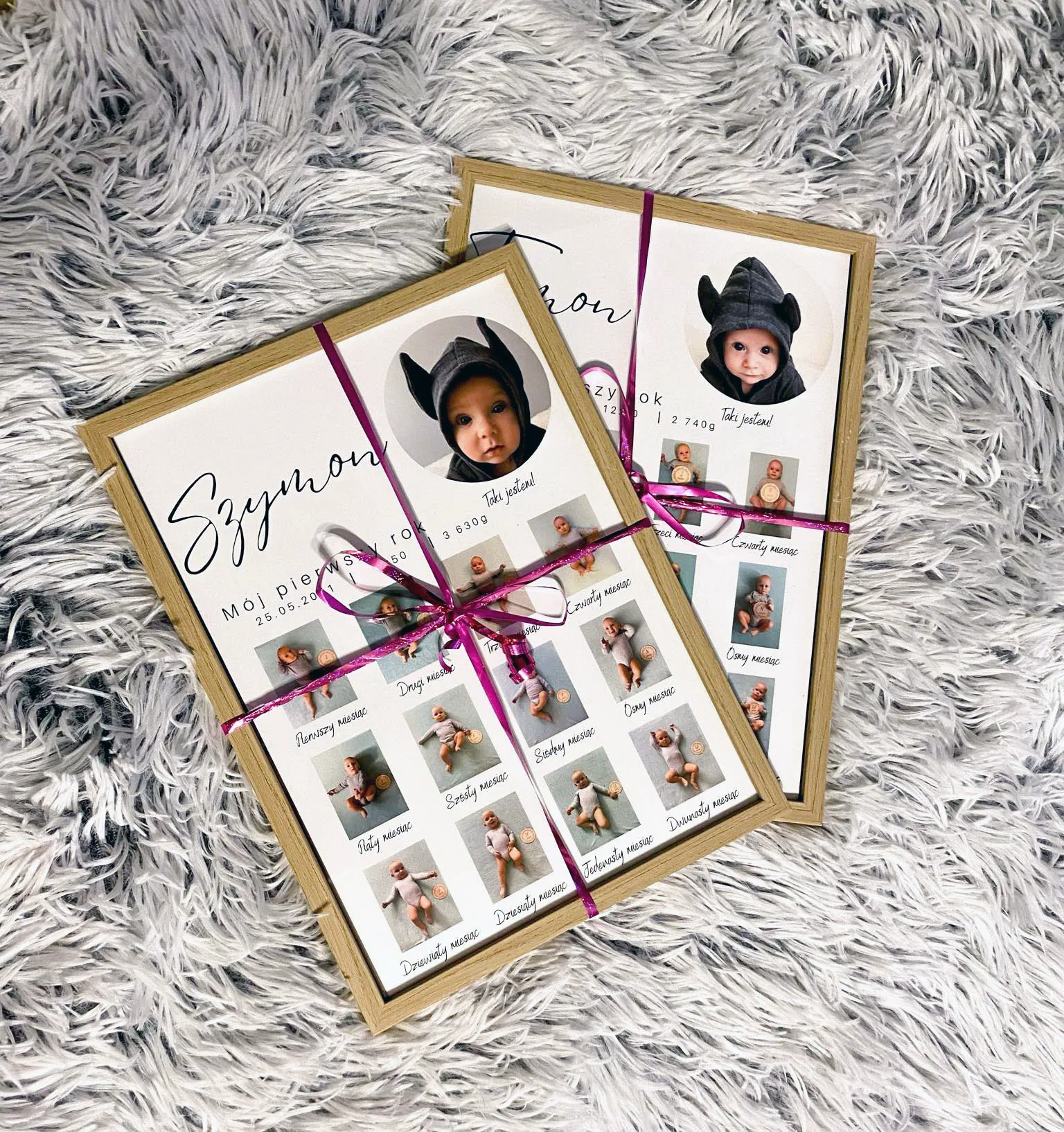 Metryczka zawiera 12 zdjęć, jedno na każdy miesiąc życia dziecka. Każde zdjęcie jest starannie opisane, aby rodzice mogli śledzić, jak ich maluszek zmieniał się i rozwijał przez pierwsze 12 miesięcy życia. Idealny sposób na uchwycenie pierwszych kroków milowych!