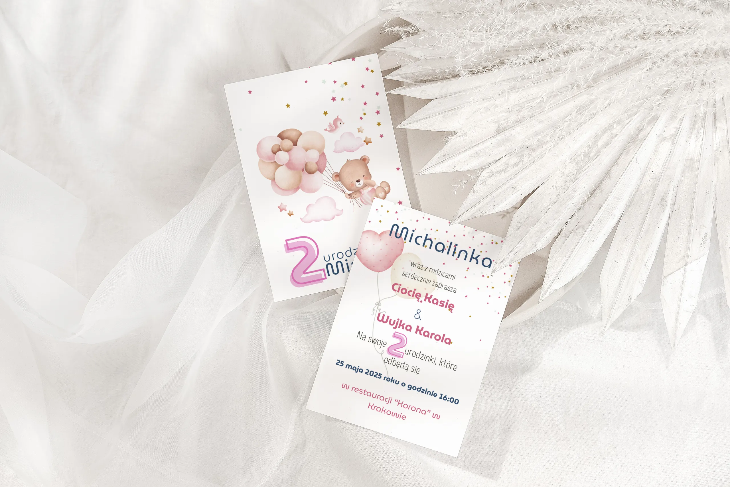 Na froncie czai się uroczy miś, szybujący na różowych balonikach, otulony miękkimi chmurkami i migoczącymi gwiazdkami. A duża, różowa „2” błyszczy jak marzenie!