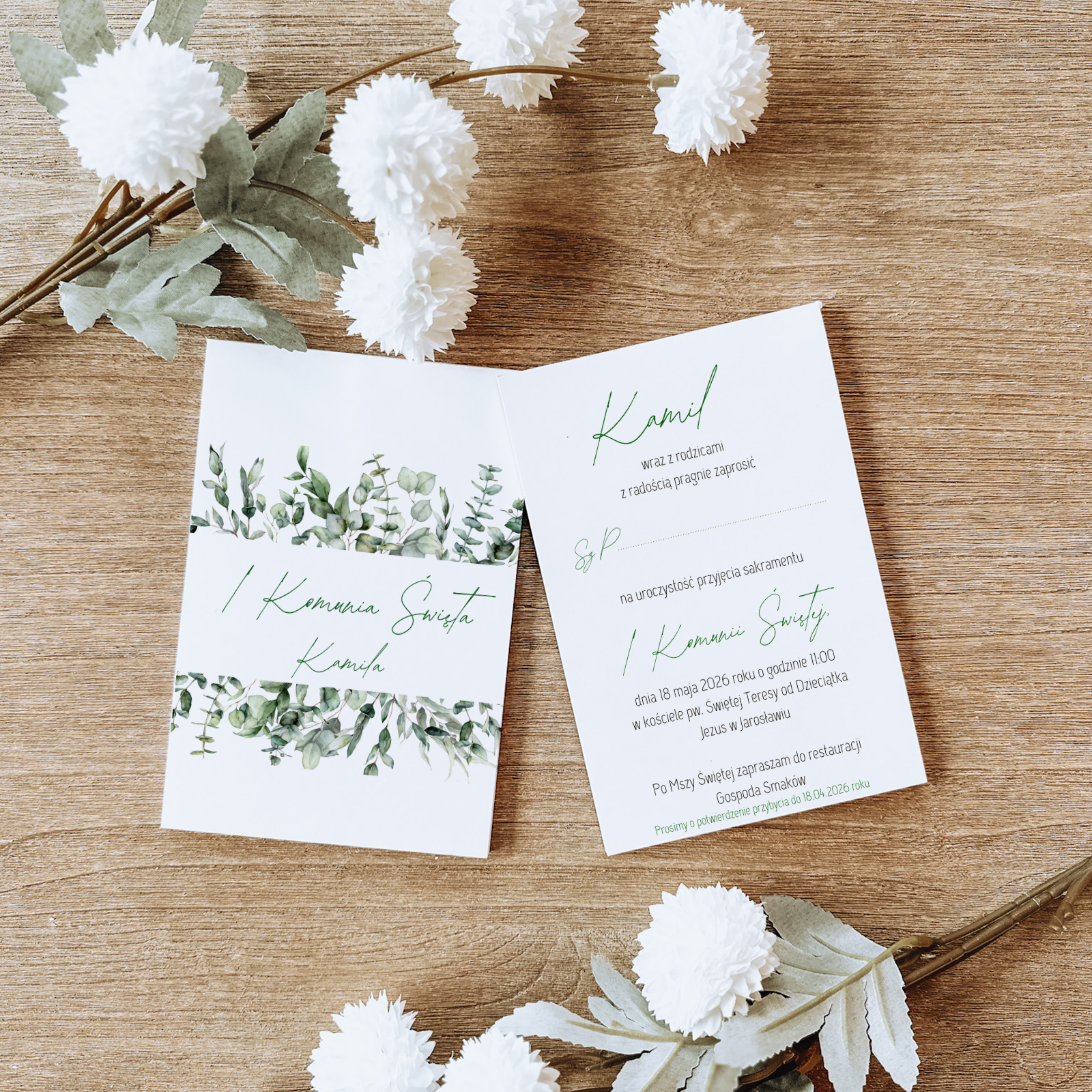 Botaniczne zaproszenie na I Komunię Świętą z motywem eukaliptusa. Elegancki, minimalistyczny design w odcieniach zieleni i złota z personalizacją imienia dziecka.