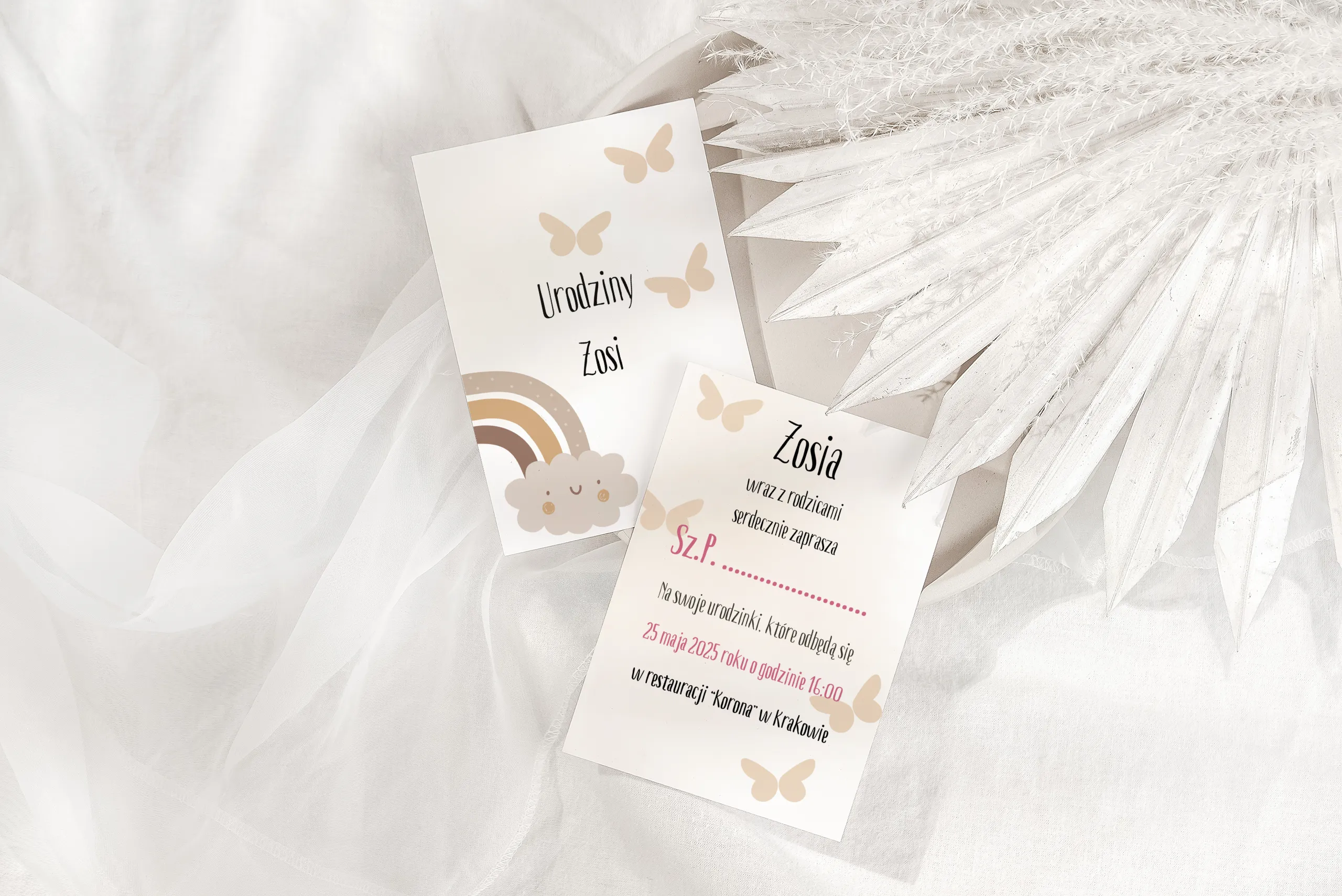 Dwustronne zaproszenie urodzinowe z motywem motylków i tęczy dla dziewczynki. Personalizowana treść, wysokiej jakości papier w kremowej tonacji.